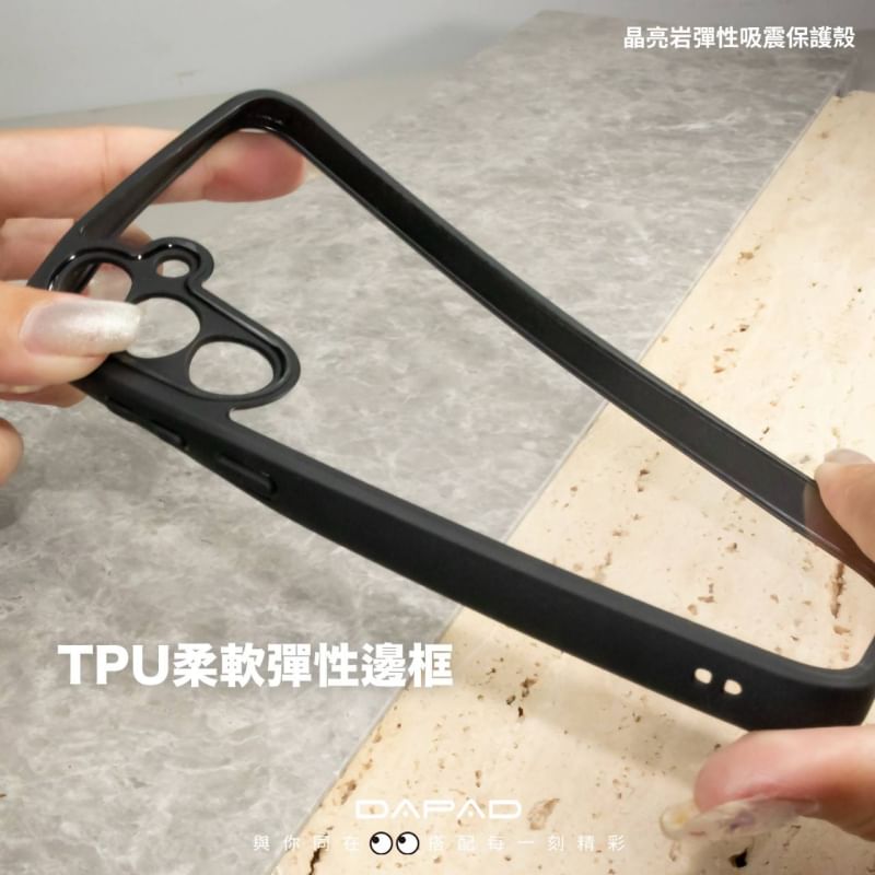 Dapad 晶亮岩彈性吸震保護殼 商品代碼:3355 顏 色:黑 型 號: 三星 A35/A55 Vivo V30PRO (V30) 小米14/小米14-Ulita OPPO Reno11 /Reno11 Pro/Reno11F 特 色: 1.高品質抗黃高透硬背,TPU吸震矽膠耐衝擊四角內氣墊。 2.精緻磨砂工藝,圓潤導角防滑手感。 3鏡頭精孔保護,螢幕周圍加高1mm完美抵御平放時磨擦傷害。