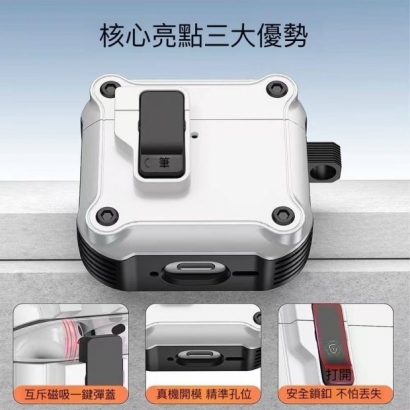 ~AirPods 彈蓋式 機甲保護套 ~ 商品代碼:3011-13 型號: AirPods PRO2 AirPods 4代 顏 色:黑,白,藍/軍綠 特色: *時尚機甲造型,邊條卡夢紋理,四角兼具防摔性能。 *真機開模,孔位精準不影響有線無線磁吸充電 *互斥磁吸一鍵彈蓋,附掛勾及安全鎖扣,可隨身佩帶 不怕丟失。 #AirPods機甲保護套