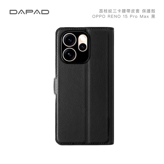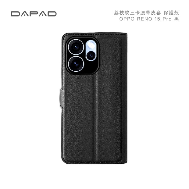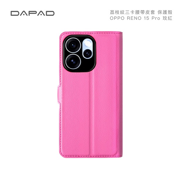 Dapad 荔枝紋三卡側翻套 商品代碼:3381 顏 色:黑、桃玫 OPPO RENO 14 黑、桃玫 RENO 14 Pro 黑、桃玫 RENO 15 Pro 黑、桃玫 RENO 15 Pro Max 黑、桃玫 特 色: 1.高質感皮套,材質柔軟,給你最佳手感 2.內部採用TPU軟殼做為內襯,拆裝不傷機 3.全包邊抗震耐摔,完美保護你的愛機 4.三卡式夾層設計,出門也可以成為簡便皮夾 5.真機開模製作,孔位精準正常操作自如
