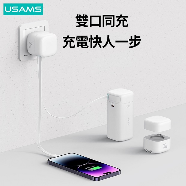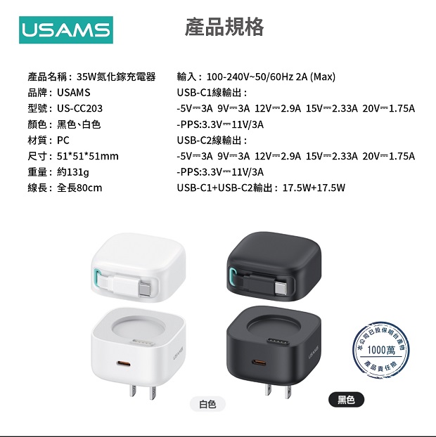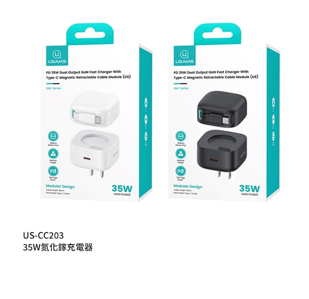USAMS 星魔方系列 PD35W GaN雙輸出 Type C磁吸收納線充電器 商品代碼:7703-23 商品型號:US-CC203 顏 色:黑色、白色 商品特色: ◆ 伸縮式充電線,隱形收納 ◆ 模組化概念,自由重组,隨時来電 ◆ 35W大功率,快充平板/手機/小家電 ◆ 支持PD+QC快充,蘋果/安卓都快充 ◆ GAN芯片,更小更快更安全 ◆ 雙口同時输出,多設備充電不排隊 ◆ BSMI認證字號R3C177
