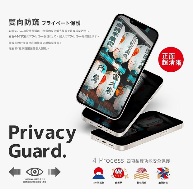 ◆ 視膜的設計原理是利用物理光學偏光技術,左右30°極致防窺保護個人隱私。
