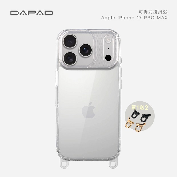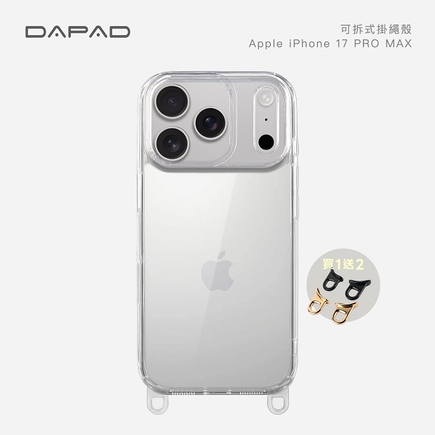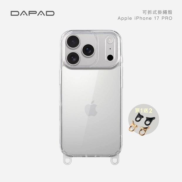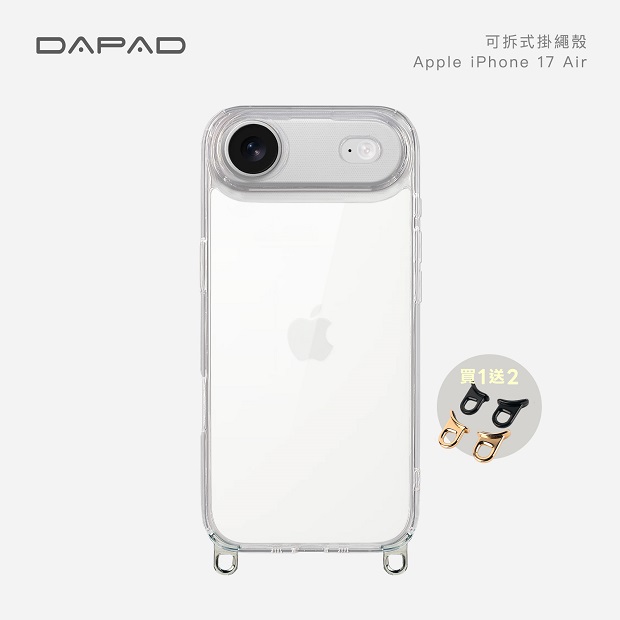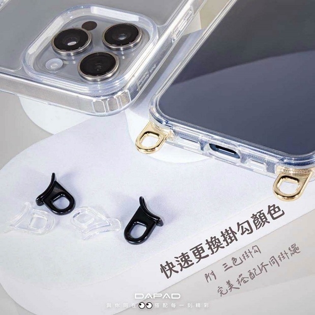 Dapad 可拆式掛繩雙料殼 商品代碼:3404 型 號: IP17 (6.3) IP17 Air (6.6) IP17 PRO (6.3) IP17 PRO Max (6.9) 商品特色: ◆ 可拆式設計,不需工具,快速更換掛勾顏色。 ◆ 附三色掛勾,完美搭配不同掛繩。 ◆ 掛勾內襯軟墊保護,不傷愛機。 ◆ PC硬底板,完美呈現手機不發黃殼。 ◆ 全包邊完美保護,緊密貼合。 ◆ 加強墊高防護,避免鏡頭跟螢幕受損。 ◆ 真機開模製作,孔位精準正常操作自如。