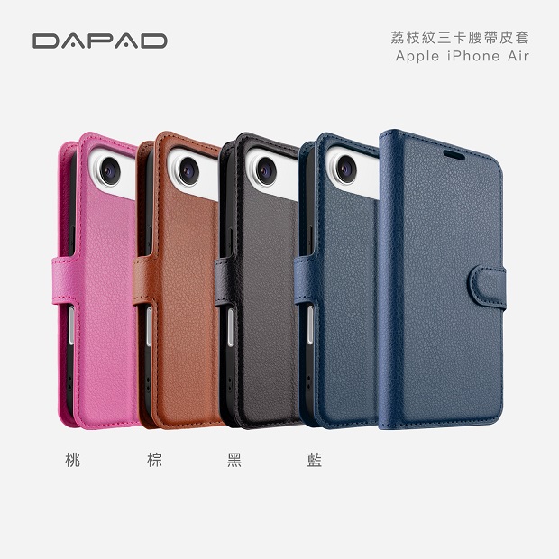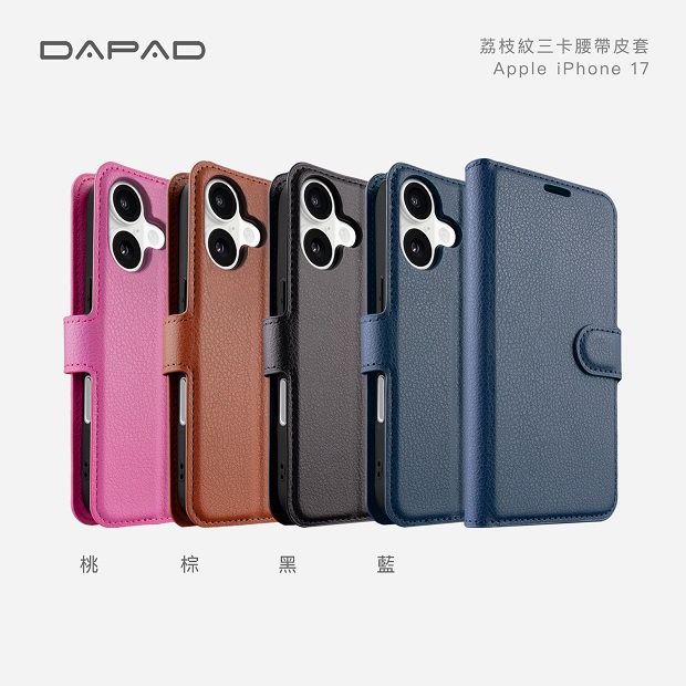 Dapad 荔枝紋三卡側翻套 商品代碼:3381 顏 色:黑、桃玫、藍、棕 型 號: iPhone 17 (6.3) iPhone Air (6.5) iPhone 17 Pro (6.3) iPhone 17 Pro Max (6.9) 特 色: 1.高質感皮套,材質柔軟,給你最佳手感 2.內部採用TPU軟殼做為內襯,拆裝不傷機 3.全包邊抗震耐摔,完美保護你的愛機 4.三卡式夾層設計,出門也可以成為簡便皮夾 5.真機開模製作,孔位精準正常操作自如