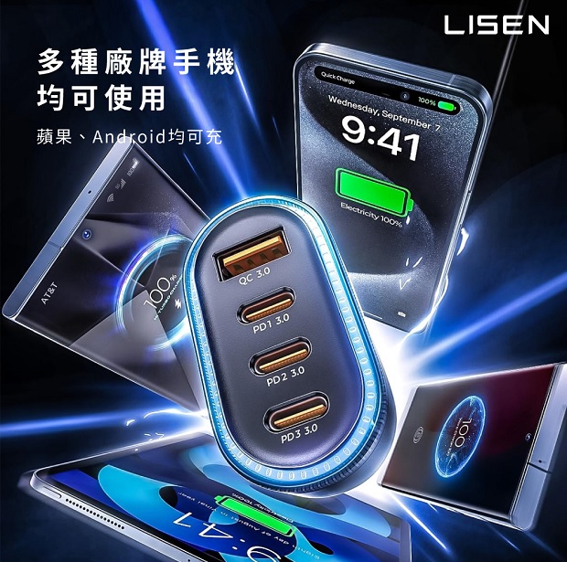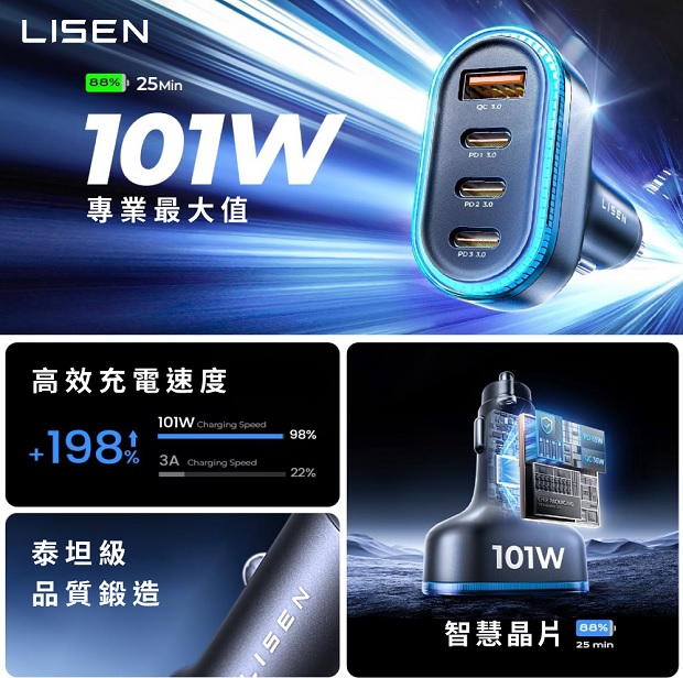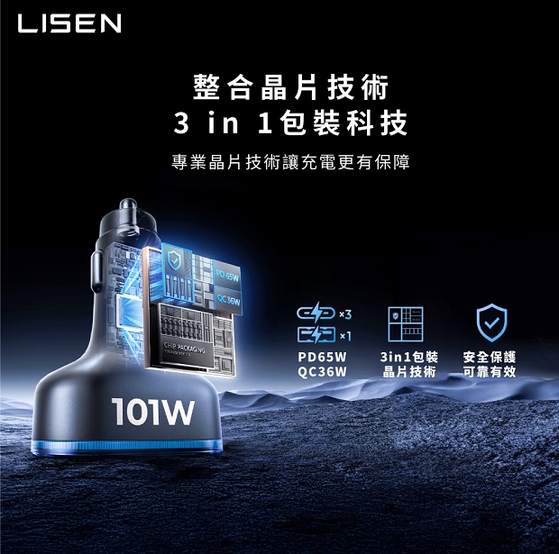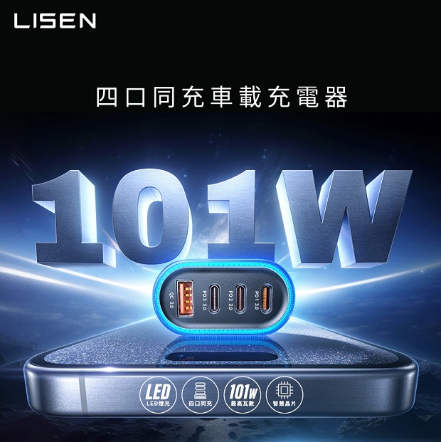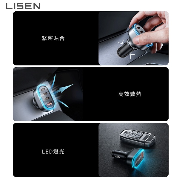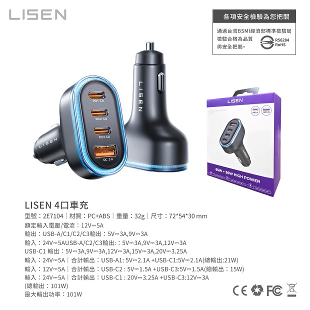 【Lisen】4口車充(3C+1A) 36W+65W 商品代碼:7750-04 商品特色: ◆ 四口同充滿足各種充電需求 ◆ 多種廠牌手機均可使用 ◆ PD1 + PD2 快充協議,雙設備同充快速滿電 ◆ 整合晶片技術,3 in 1包裝科技 ◆ LED燈光設計 夜晚輕鬆定位車充位置 ◆ 緊密貼合 / 高效散熱 / LED燈光