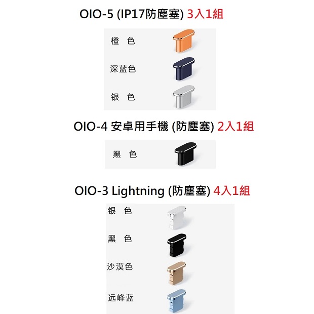 iGoder iPhone 17 系列 防塵塞 商品代碼:OIO-5 顏色:銀色 / 藍色 / 橘色 (3入1組) 適用規格:iPhone 15 後續機型 商品代碼:OIO-4 顏色:黑色 (2入1組) 適用規格:安卓機型 商品代碼:OIO-3 顏色:黑色 / 銀色 / 天藍色 / 金色 (4入1組) 適用規格:Lightning 機型 商品介紹 : ◆ 採用改良的加厚硅膠內崁,無需擔心損壞手機內部,保護手機。 ◆ 接口的長度與手機充電口深度一致,夾帶面蓋更貼合。 ◆ 防塵防水漬,保護接口,預防意外,持續護航。