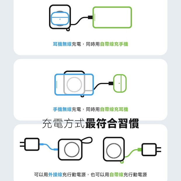 ◆ 自帶 Type C + Lightning 雙充電線,外出攜帶方便。