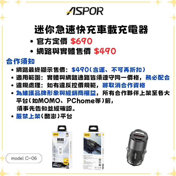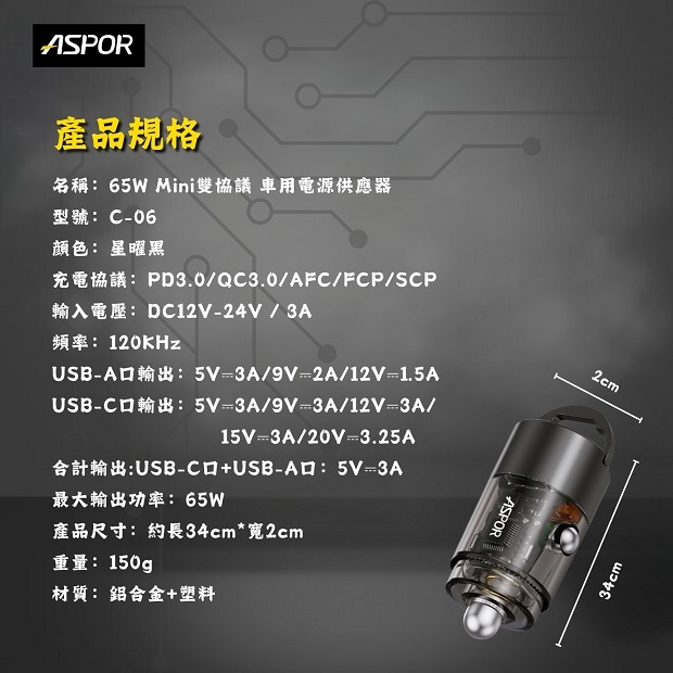 ASPOR Mini PD+QC 65W急速快充車載充電器 商品代碼:7754-3 BSMI認證 : R45160 商品特色: ◆ 極致迷你體積,小巧不占空間。 ◆ 精密卡扣,顛波路況也能穩固卡位。 ◆ PD+QC 雙口輸出,急速快充。 ◆ 隱藏式拉環設計,單收操作好方便。 ◆ 鋁合金+透明工藝,看得見的科技感。 ◆ 多重安全保護,全程安心快充。 ◆ 65W強勁智慧芯片,穩定輸出。
