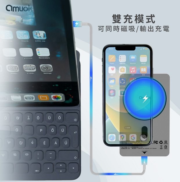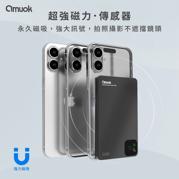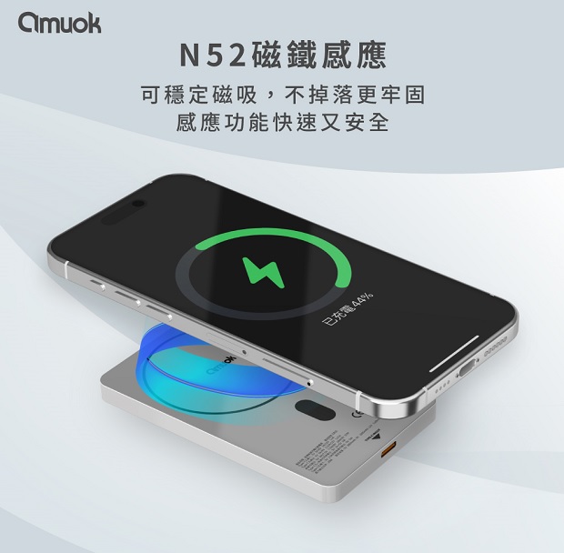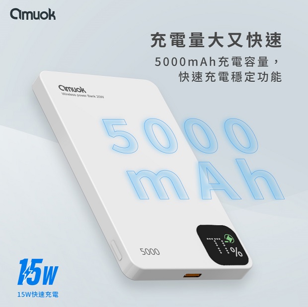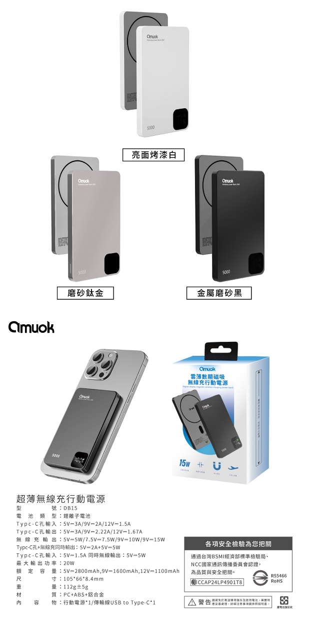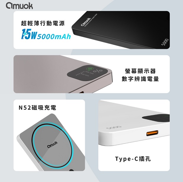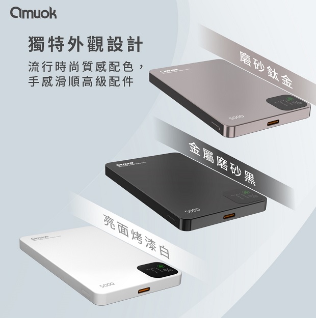 【amuok】雲薄數顯磁吸無線充行動電源5000mAh 商品代碼 : PW-AMUOK-5000-1 商品顏色 : 磨砂黑 / 鈦金色 / 烤漆白 BSMI認證 : R55466 NCC認證 : CCAP24LP4901T8 商品特色 : ◆ 15W無線快速充電 ◆ N52強力磁吸,感應功能快速又安全 ◆ 電量數顯提示,隨時掌握剩餘電量 ◆ 高品質聚合物鋰電池,更輕薄 ◆ 獨特外觀設計,手感滑順 ◆ 開關鍵一體式設計,貼合本體