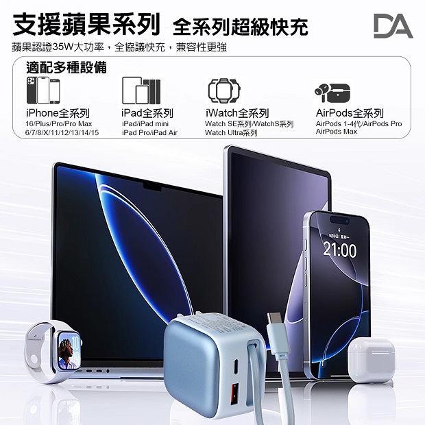 ◆ 35W GaN超速充電,搭載最新氮化鎵晶片,比一般充電器快上兩倍。