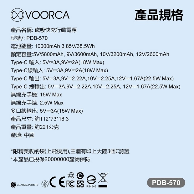 CCC認證 Wh標示 VOORCA PDB570 超薄型行李箱 10000mAh 行動電源