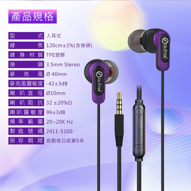 ~ GLiTTER 3.5mm入耳式高音質耳機 ~ 產品代碼:PH-74 產品型號:GT5100 商品規格: 喇叭直徑:φ.10mm 喇叭阻抗:32 ±20%Ω 喇叭靈敏度:96±3dB 頻率範圍:20~20K Hz 線長:120 cm±3% (含接頭) 線身材質:TPE塑膠 接頭:3.5mm Stereo 麥克風:Ø 40mm 麥克風靈敏度:-42±3dB 商品介紹: ◆ 卓越音質 聽覺饗宴 ◆ HiFi 高音質 ◆ 入耳舒適 牢固配戴 ◆ 音樂 通話 三線鍵控