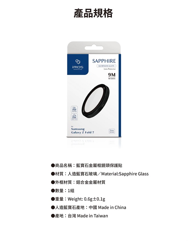 SAMSUNG Galaxy Z Fold 7 鏡頭保護鏡-(黑框) 商品代碼:3109-56 顏 色:黑色 商品特色: ◆ 絕佳透度,盡顯實像,完美鏡面,還原世界真實色彩。 高硬度9M的藍寶石光學玻璃,抗刮、耐磨,高清透光! ◆ 超高硬度,無懼磨損。 高品質材料與先進工藝製成!