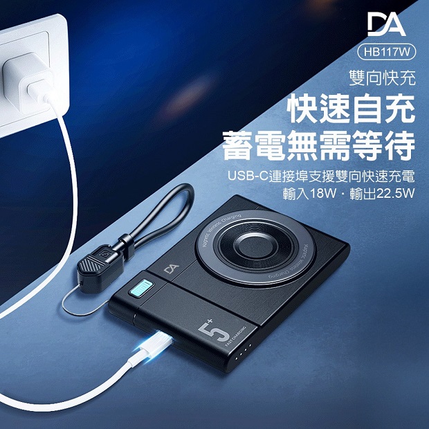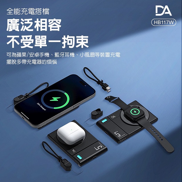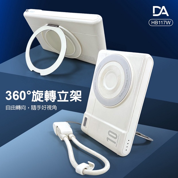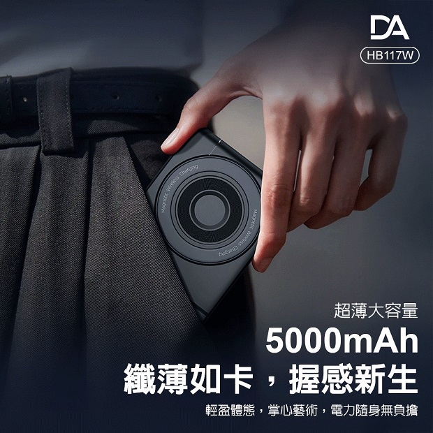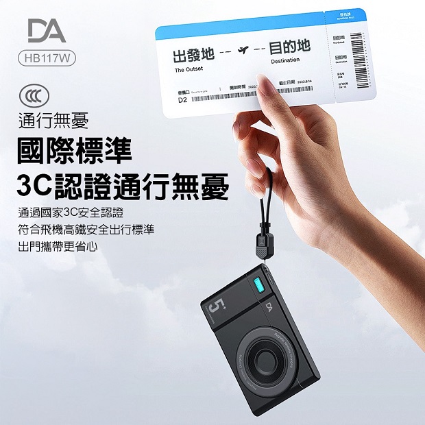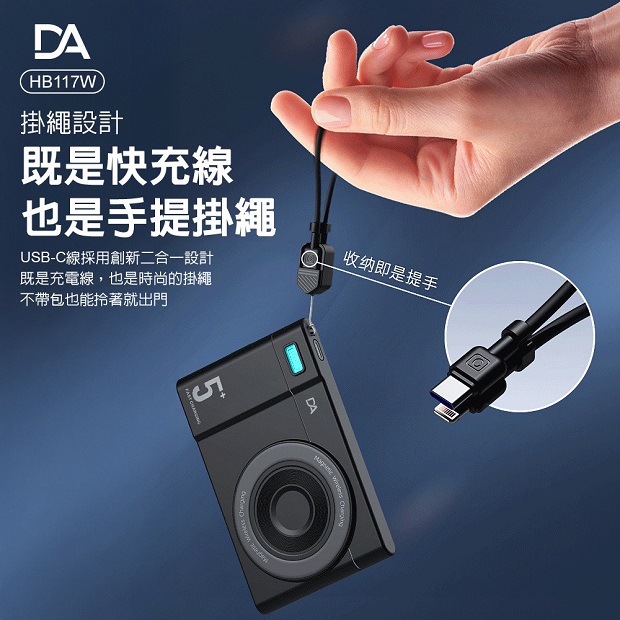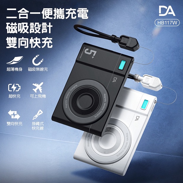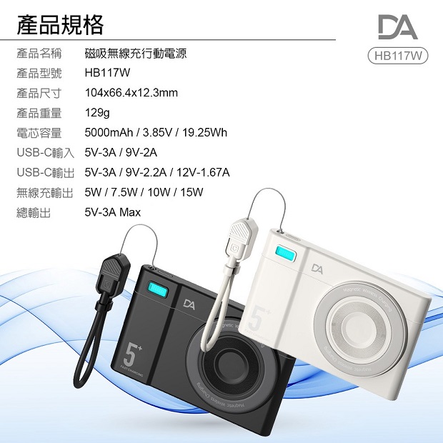 DA 相機小卡充5000mah 3合1 磁吸行動電源 商品代碼 : PW-DA-5000-2 價格代碼:ZZLHD 商品型號 : HB117W 商品特色 : ◆ 外型超薄迷你體積。 ◆ 支持手機/手錶/藍芽耳機,無線充電。 ◆ 附360旋轉支架。 ◆ C口支持雙向充電。 ◆ 附有 C to C 充電線,可當掛繩使用。 ◆ 附有 Type-C & Lightning線,無需額外攜帶充電線。 ◆ 通過台灣NCC/BSMI雙認證,大陸3C認證。