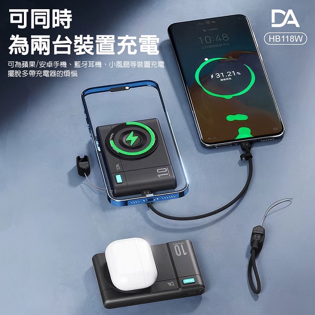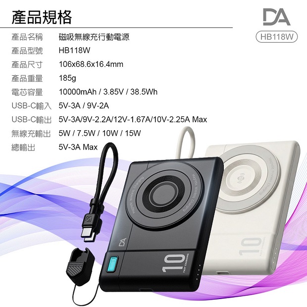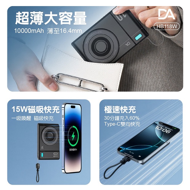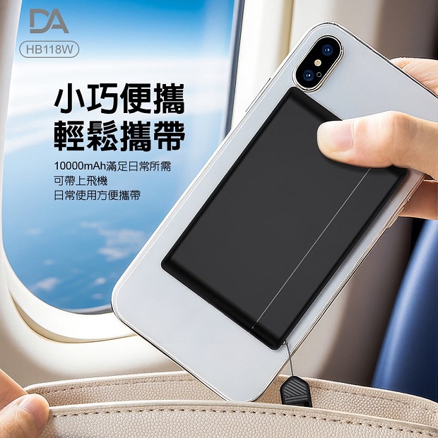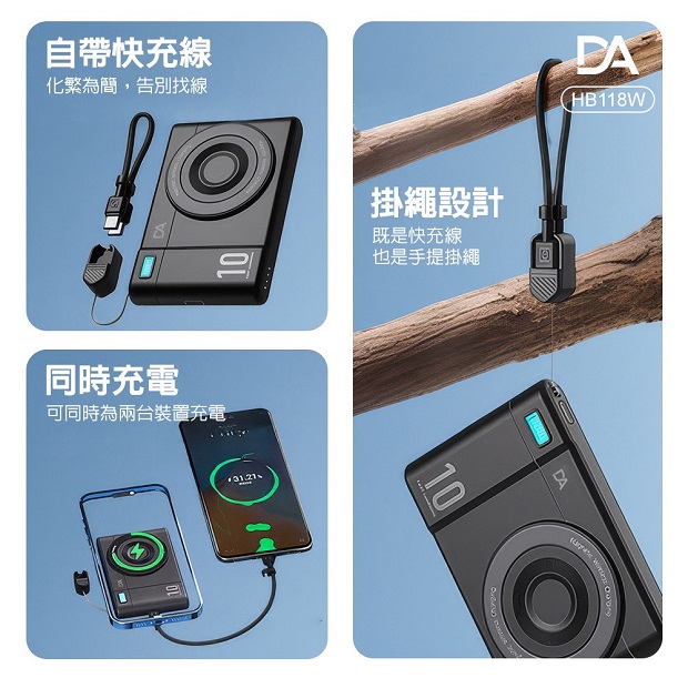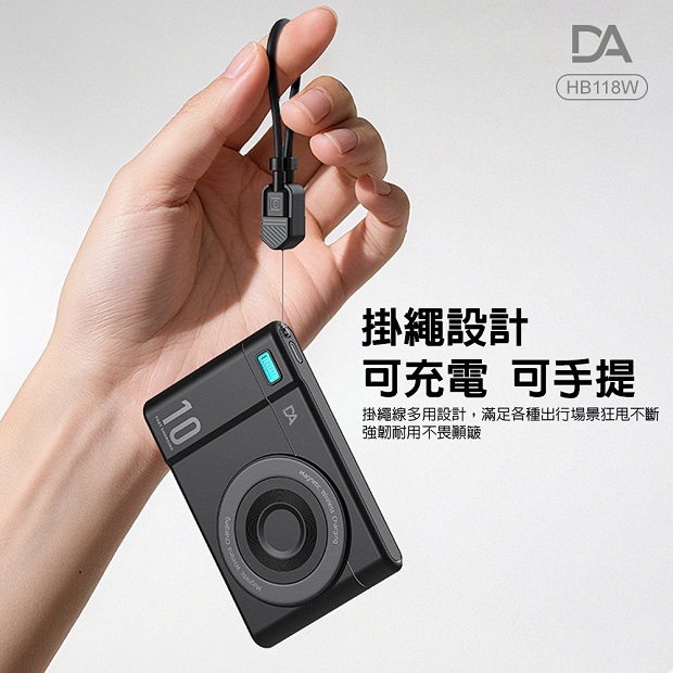 DA 相機小卡充10000mah 3合1 磁吸行動電源 商品代碼 : PW-DA-10000-6 價格代碼:ZZLQM 商品型號 : HB118W 商品特色 : ◆ 外型超薄迷你體積。 ◆ 支持手機/手錶/藍芽耳機,無線充電。 ◆ 附360旋轉支架。 ◆ C口支持雙向充電。 ◆ 附有 C to C 充電線,可當掛繩使用。 ◆ 附有 Type-C & Lightning線,無需額外攜帶充電線。 ◆ 通過台灣NCC/BSMI雙認證,大陸3C認證。
