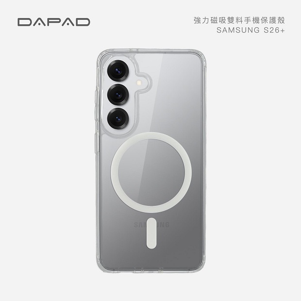 Dapad 強力磁吸雙料殼 商品代碼:3354 價格代碼:ZZEMD 商品型號 : 三星 S26 5G 三星 S26+ 5G 三星 S26 Ultra 5G 商品特色: ◆ 兼容磁吸功能,磁力加倍,使用無線充電也超順暢。 ◆ 四角防摔氣囊,有效降低手機摔落衝擊力。 ◆ 鏡頭框、邊框加高防護,完美抵禦平放時摩擦傷害。 ◆ 軟硬雙重保護,抗發黃透明背板+吸震軟膠邊框。 ◆ 一體成型按鍵,靈敏回饋,特務磨砂處理,不手滑。 ※ 磁吸效果會因不同裝置與產品產生差異。
