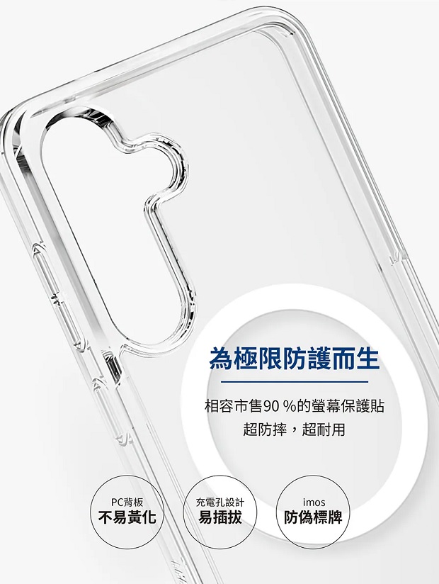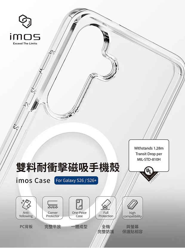 imos 三星 S26系列 磁吸軍規認證雙料防震保護殼 - 透明 商品代碼:2541-48 ( 透明款) 適用型號: S26 S26+ S26 Ultra 商品特色: 1.高防護軍規等級 - 通過檢測權威機構認證。 2.全新體驗 掌握在指尖 - 貼合機身按鍵設計。 3.背面完整平放 - 革命性防護,四角凸出緩衝設計,完整平放不擔心。 4.雙料全面性完整包覆 - 2.5mm防撞背板,讓您外出安心冒險,軟性TPU鏡頭緩衝匡凸出設計。 5.磁吸充電,創意不減 - 背蓋磁吸穩固充電,書寫繪圖不斷線。