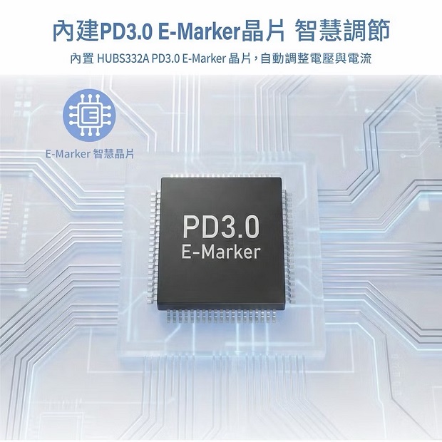 ◆ 內置HUBS332A PD3.0E-Marker晶片,自動調整電壓與電流