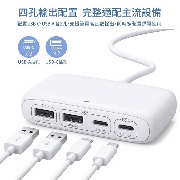 ◆ 配置USB-C、USB-A各2孔,支援筆電高瓦數輸出,同時多裝置供電使用