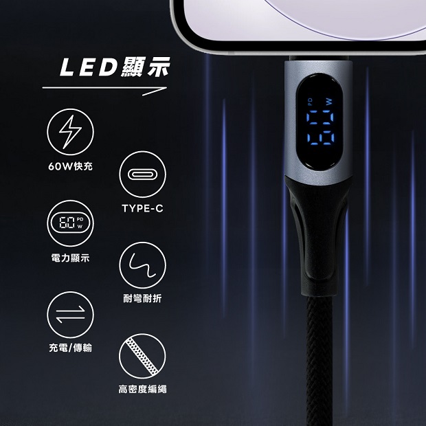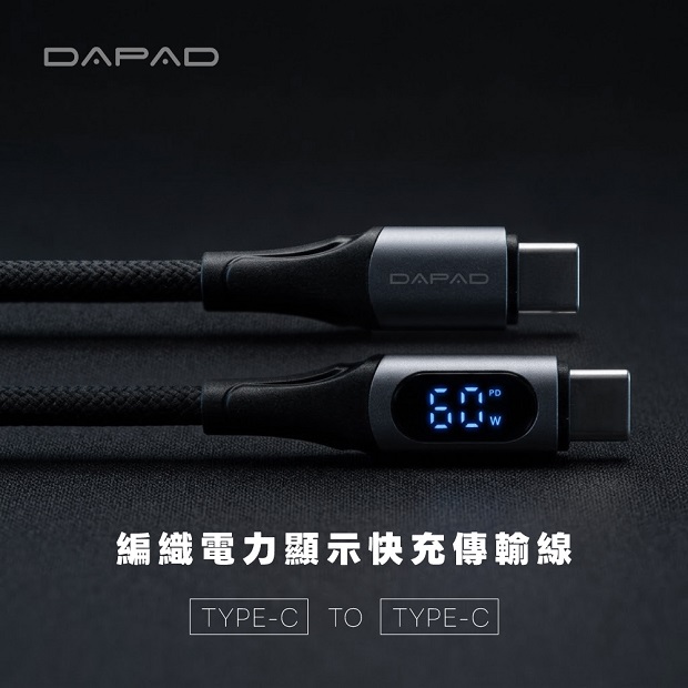 DAPAD 編織電力顯示快充傳輸線 60W TYPE-C TO TYPE-C 商品代碼:8811-17 價格代碼:ZZELD 商品特色: 快充傳輸好朋友,支援所有TYPE-C接頭產品,同步充電和傳輸,30W穩定傳輸效率提升 ◆ 支援所有TYPE-C接頭產品 ◆ 60W穩定傳輸效率提升,安全快速 ◆ 高密度編繩線體,結實抗拉扯的折彎設計 ◆ LED螢幕即時顯示充電功率 ◆ 強化接頭,有效延長充電線壽命 ◆ 充電傳輸二合一,省時又高效 ◆ 長度:1.2 M