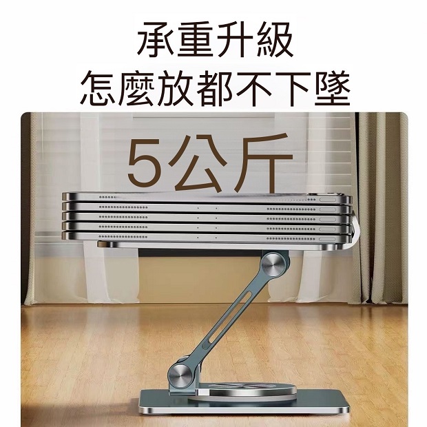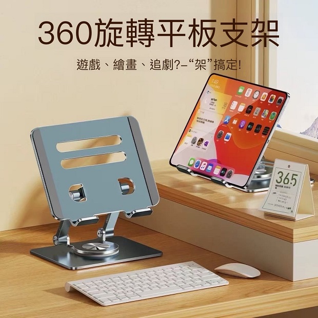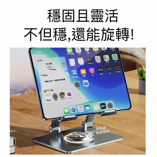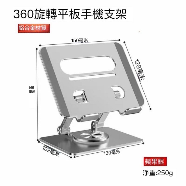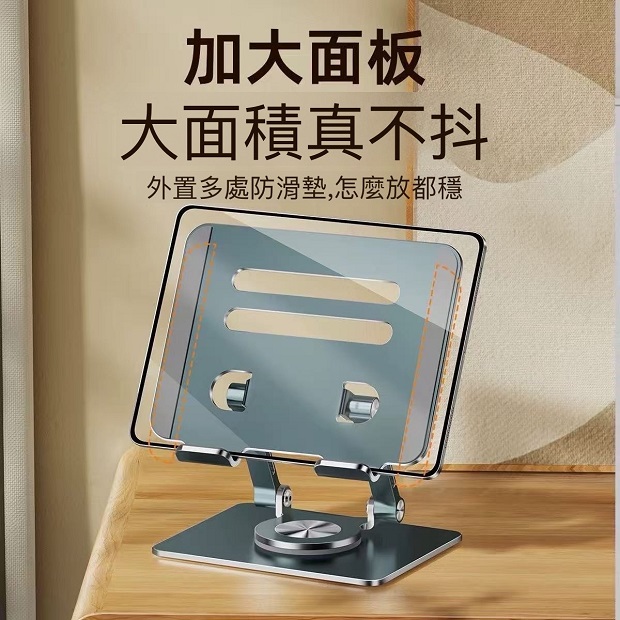 鋁合金360度桌上平板支架 商品代碼 : C006-15 價格代碼 : ZZHAD 商品顏色 : 銀色 商品特色 : ◆ 無阻旋轉 / 更高更穩 / 摺疊收納 ◆ 全金屬加厚底座 穩固不晃 ◆ 硅膠防滑 ◆ 360°旋轉 無死角觀影 ◆ 手機 平板通用 ◆ 承重升級 耐重5 KG