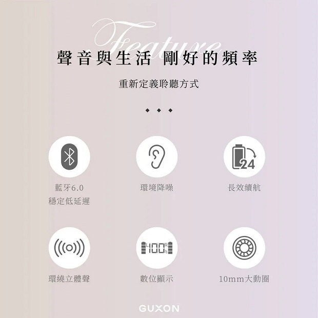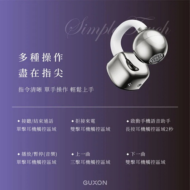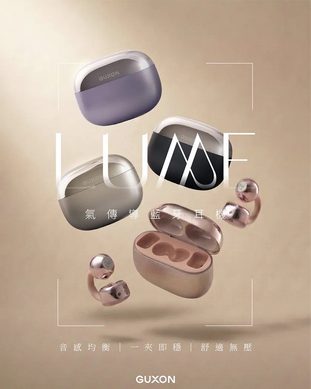 〔此為預購商品,預計5月中下旬到貨,歡迎來電預購〕 【GUXON】LUME氣傳導開放式藍牙耳機 G11 商品代碼: 價格代碼: 商品顏色 : 質感黑 / 時尚銀 / 薰衣紫 / 玫瑰粉 商品介紹: ◆ 藍牙6.0 穩定低延遲 ◆ 三角結構 舒適配戴 ◆ 超輕巧42g ◆ 開放式精準傳音 ◆ IPX4 防潑水設計 ◆ 全景立體聲聽感 ◆ 10mm 大動圈 ◆ 穩定連線 全面升級 ◆ 從早到晚的電力支援 ◆ 多種操作 盡在指尖