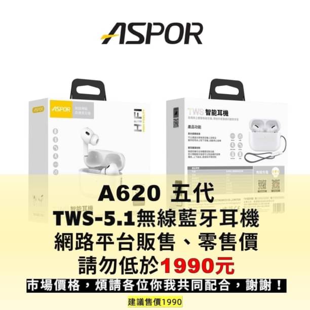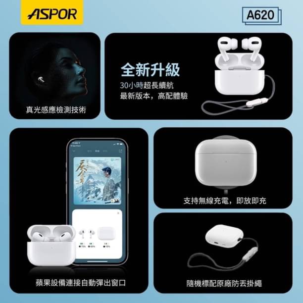 ~ASPOR® A620五代真無線藍芽耳機~ 商品代碼:BA-A620 價格代碼:ZZQMD 顏 色:白 1.全新新包裝優化再上市價格更加CP 2.媲美原廠耳機享受個人化空間音訊 3.開蓋彈跳視窗、觸摸控制容易 4.好操控,氣墊入耳可調適合舒適耳塞 6.支持有線、無線充電 5.續航力持久(最長續航30h) 「廠商禁亂價,需控價(實體與網路) 無法配合者,請勿下單」