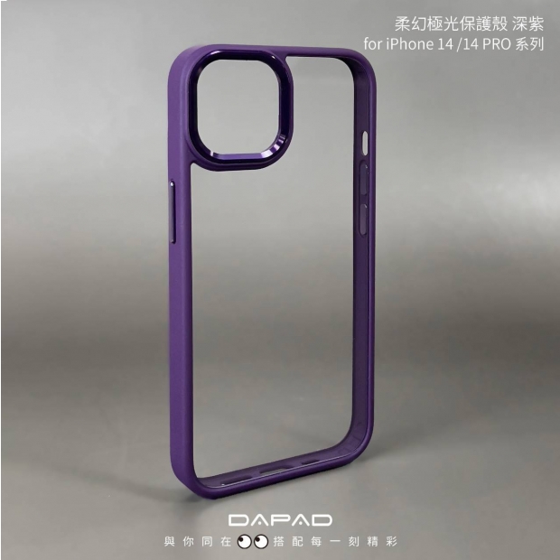 ~ Dapad IP14系列 柔幻極光防摔殼 ~ 商品代碼:3360 顏 色: 黑/粉/透明/深藍/天藍/淺紫/綠 型 號: IP14/IP13(6.1)(深紫)New IP14 PLUS 6.7(深紫)New IP14 Pro (6.1) (深紫)New IP14 Pro Max (6.7) (深紫)New 1.高品質抗黃高透硬背,金屬按鍵、TPU吸震矽膠耐衝擊四角內氣墊。 2.精緻磨砂工藝,圓潤導角防滑手感。 3.高質感磨砂金屬鏡頭保護圏加4mm,螢幕周圍加高1mm完美抵御平放時磨擦傷害。